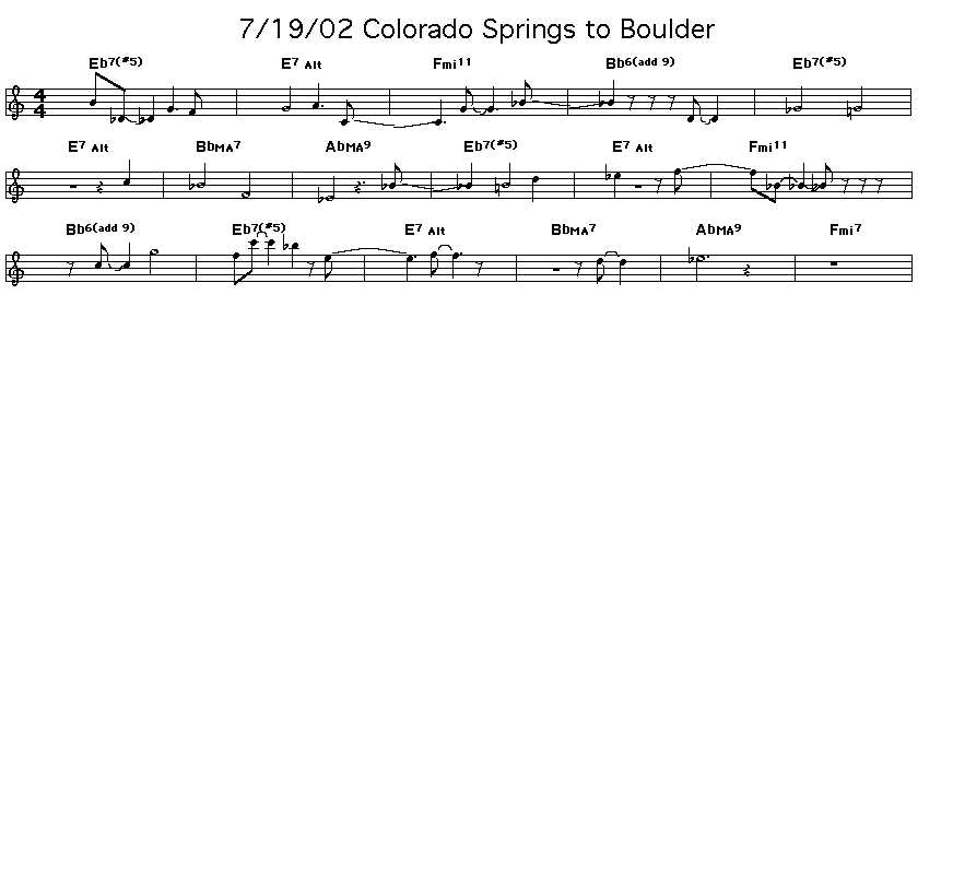 | I found the chord progression for this the morning of 7/19/02 while waiting to depart our hotel in Colorado Springs. Completed the tune as we drove to Boulder later that morning.